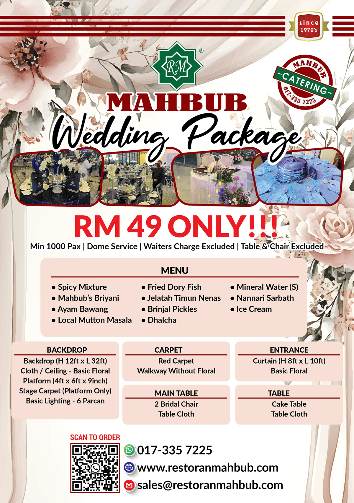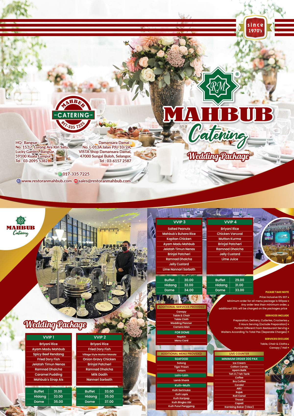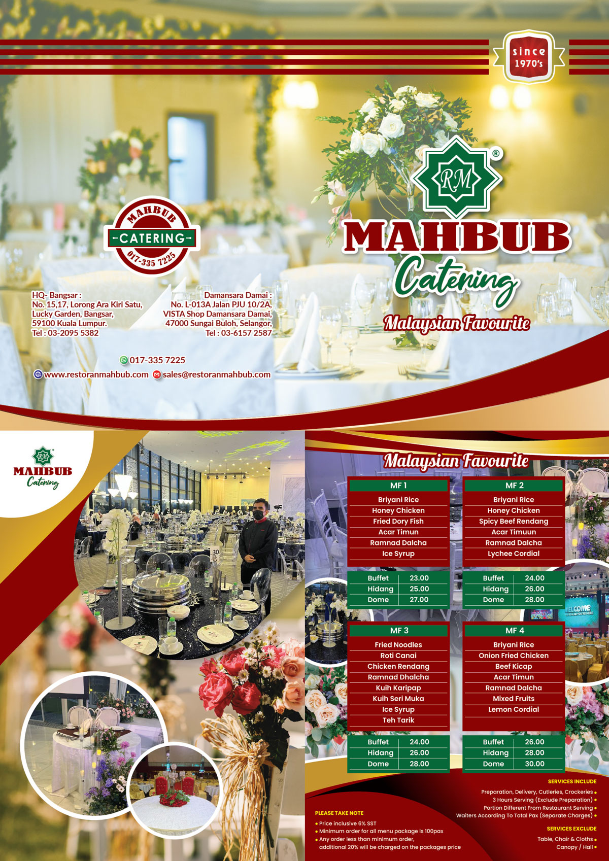 Delight your guests with mouthwatering signature dishes (Nasi Briyani/Nasi Buhara) for lunch/dinner function specially brought to you & your guests by Restoran Mahbub food catering for all occasions. We covered types of food catering services, such as Buffet, Table, Dome, VIP & VVIP. Welcome to ask for quote via the online form or you may WhatsApp us too! We can't wait to serve you soon.